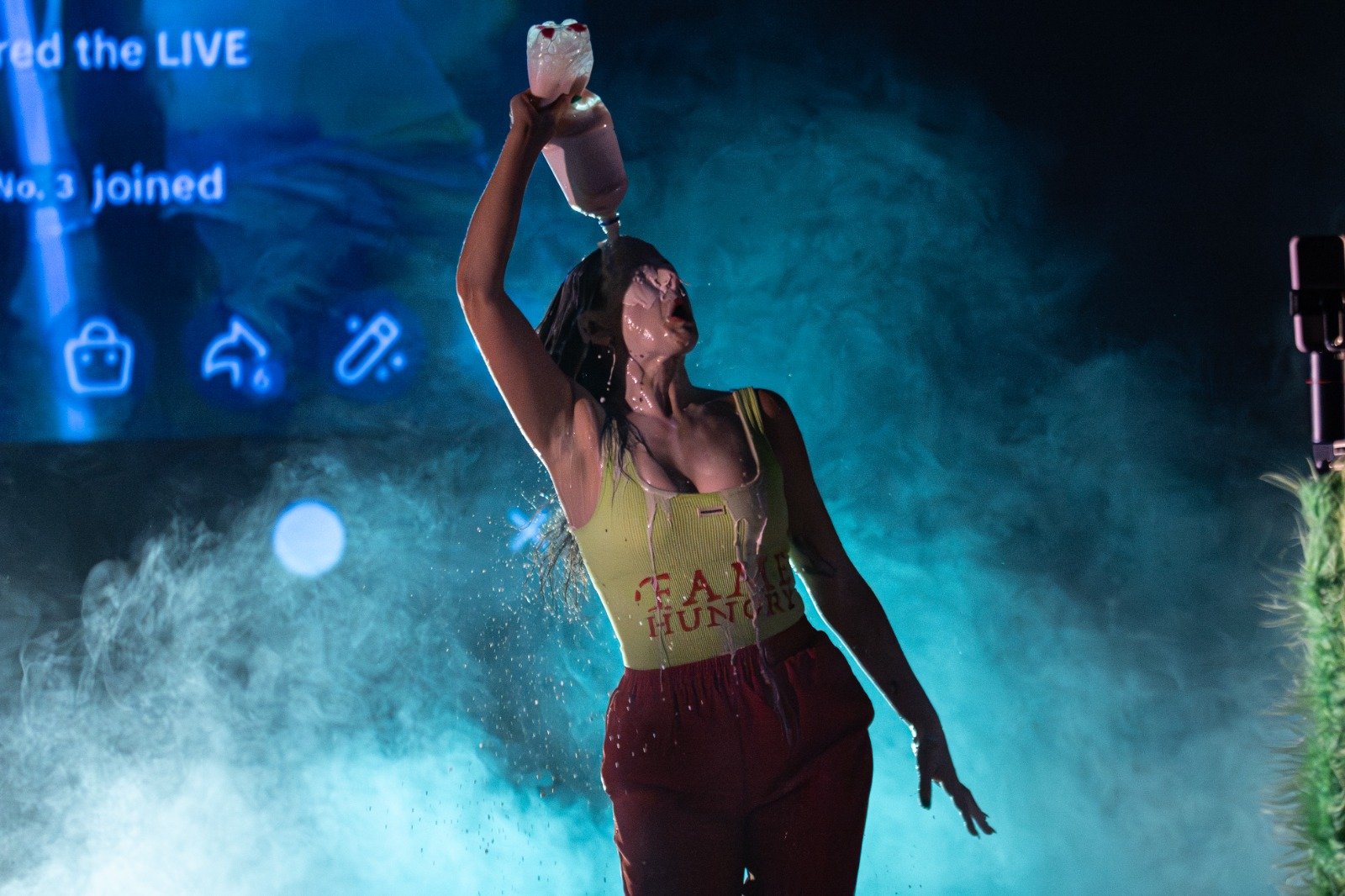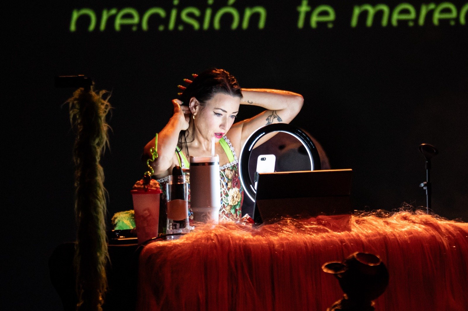 Ella, por ejemplo, no teme ser causa de pena ajena durante la obra con su tono de voz y frases trilladas lanzadas al público al otro lado de la pantalla, aunque vamos entendiendo el contexto de lo que pretende señalar, el ‘aceleracionismo’ en el que vivimos y el conflicto que implica la creciente necesidad de validación en redes. La otra audiencia solo sirve como respaldo de lo que ella va señalando, pues se mantiene atenta durante una hora y veinte minutos solo por la promesa de que, al llegar a los veinte mil likes, número que sobrepasa, ella hará algo impresionante: bañarse en líquido (parece leche) mientras canta Bohemian Rhapsody, de Queen, con una guitarra eléctrica, presenta al público del teatro, para sorpresa de muchos de sus internautas, y cierra la función.