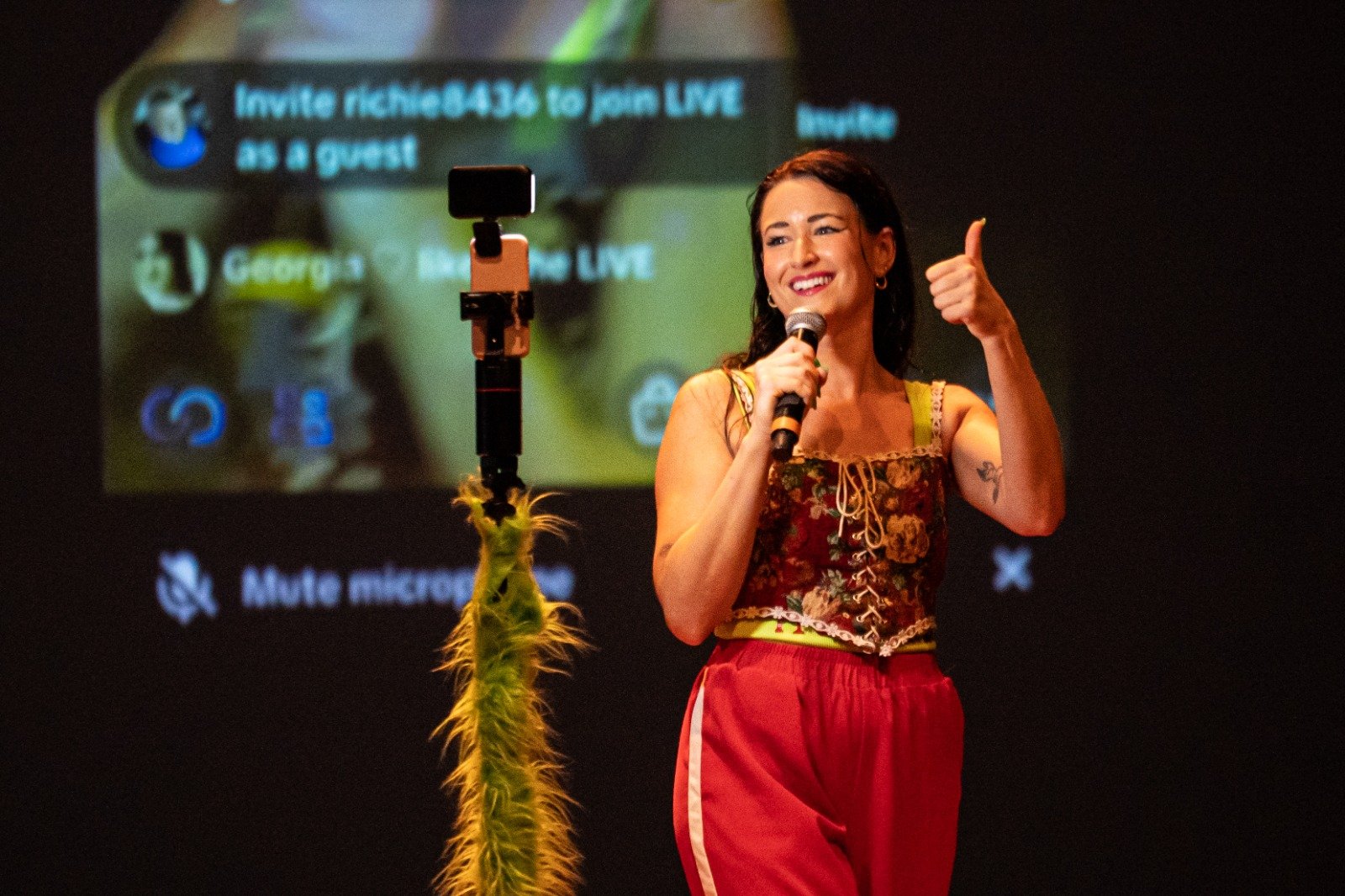 Una función extrañísima tuvo lugar en el escenario del Teatro Cervantes el domingo 19 y el lunes 20 de octubre, traída por el British Council para ser una de las puestas en escena representantes del país invitado: Reino Unido. Pero estoy mintiéndote si te digo que la obra se llevó a cabo solo en el teatro, pues esta función contó con un segundo público: la audiencia participante en el live de TikTok de Louise Orwin, directora, escritora y protagonista de la función.