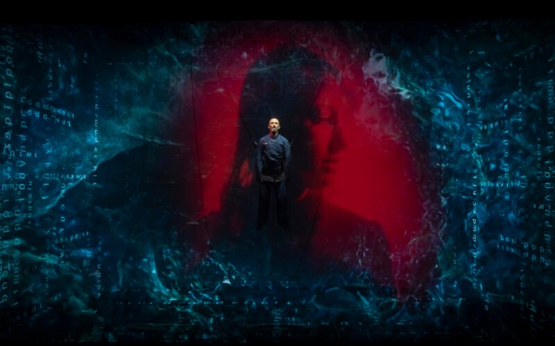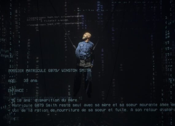 El telón se levanta para dejar ver, tras de sí, a un hombre tirado sobre la obscuridad, encadenado. Cual títere, es elevado, de a poco, al centro de la escena para, una vez llegado ahí, romper el silencio con gritos provocados por las descargas eléctricas sobre él, al tiempo que cuatro enormes pantallas se encienden alrededor generando una especie de cárcel, de orbe digital y tecnológico donde el Gran Hermano se presenta como un dios omnipotente que visualiza y controla cada aspecto de la vida pública y privada de la sociedad.