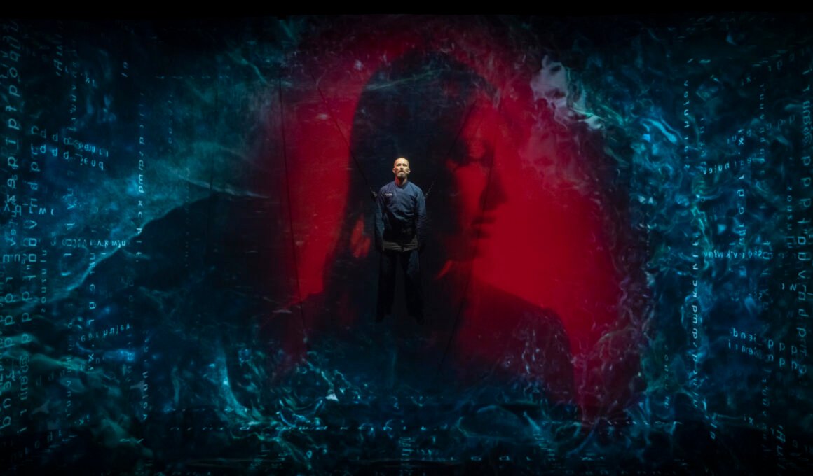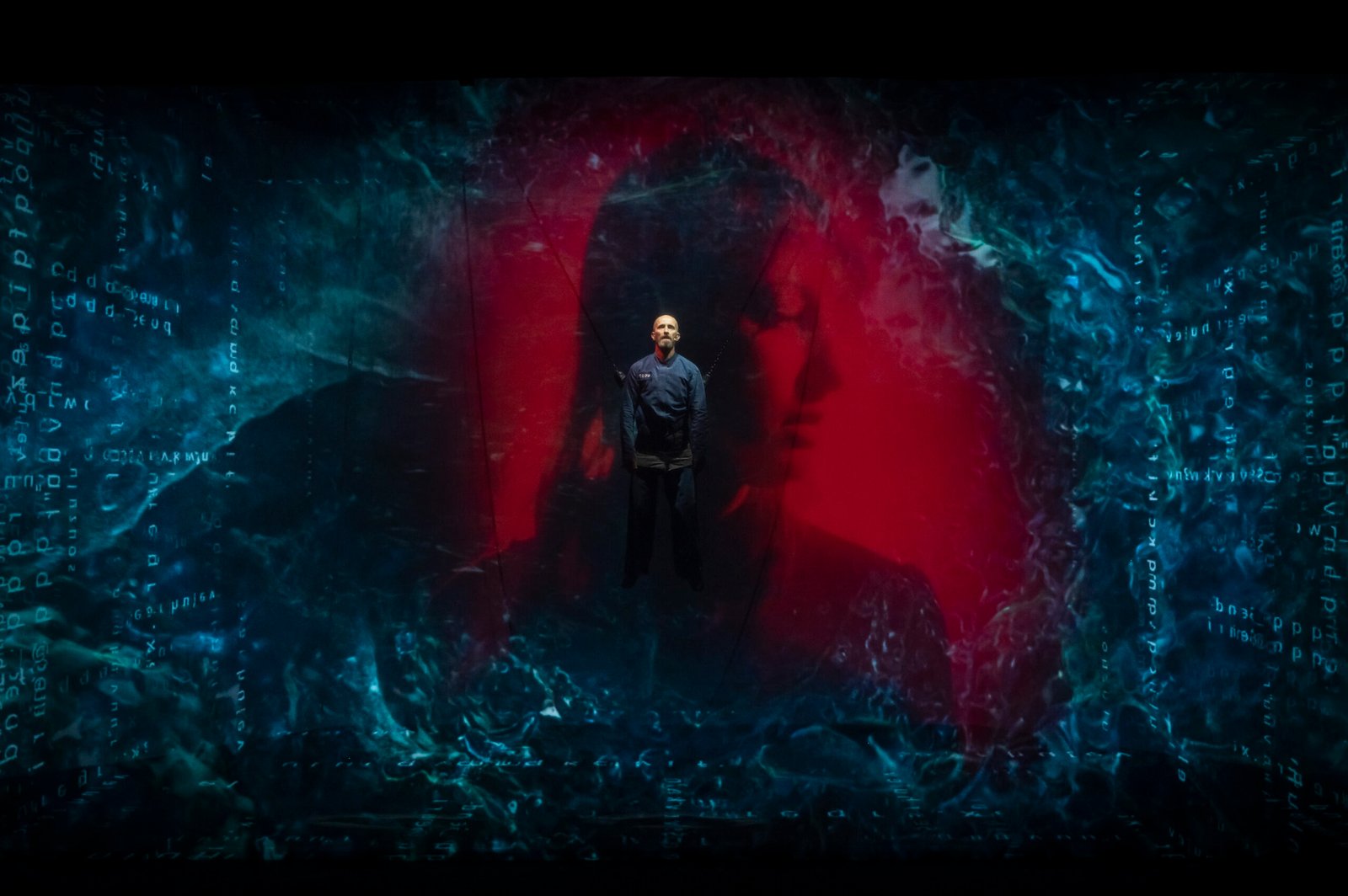 El telón se levanta para dejar ver, tras de sí, a un hombre tirado sobre la obscuridad, encadenado. Cual títere, es elevado, de a poco, al centro de la escena para, una vez llegado ahí, romper el silencio con gritos provocados por las descargas eléctricas sobre él, al tiempo que cuatro enormes pantallas se encienden alrededor generando una especie de cárcel, de orbe digital y tecnológico donde el Gran Hermano se presenta como un dios omnipotente que visualiza y controla cada aspecto de la vida pública y privada de la sociedad.